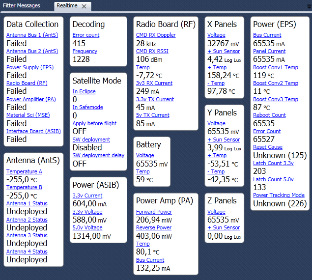 В телеметрии не всё ОК. Почему-то все три солнечные панели показыывают полный ноль напряжения, при этом шины бортового напряжения в норме.Мощность передатчика 158,45 мВ. Потребление по шинам 3,3 и 5 вольт тоже вроде нормальное. Не нулевое, по крайней мере.... Странно.